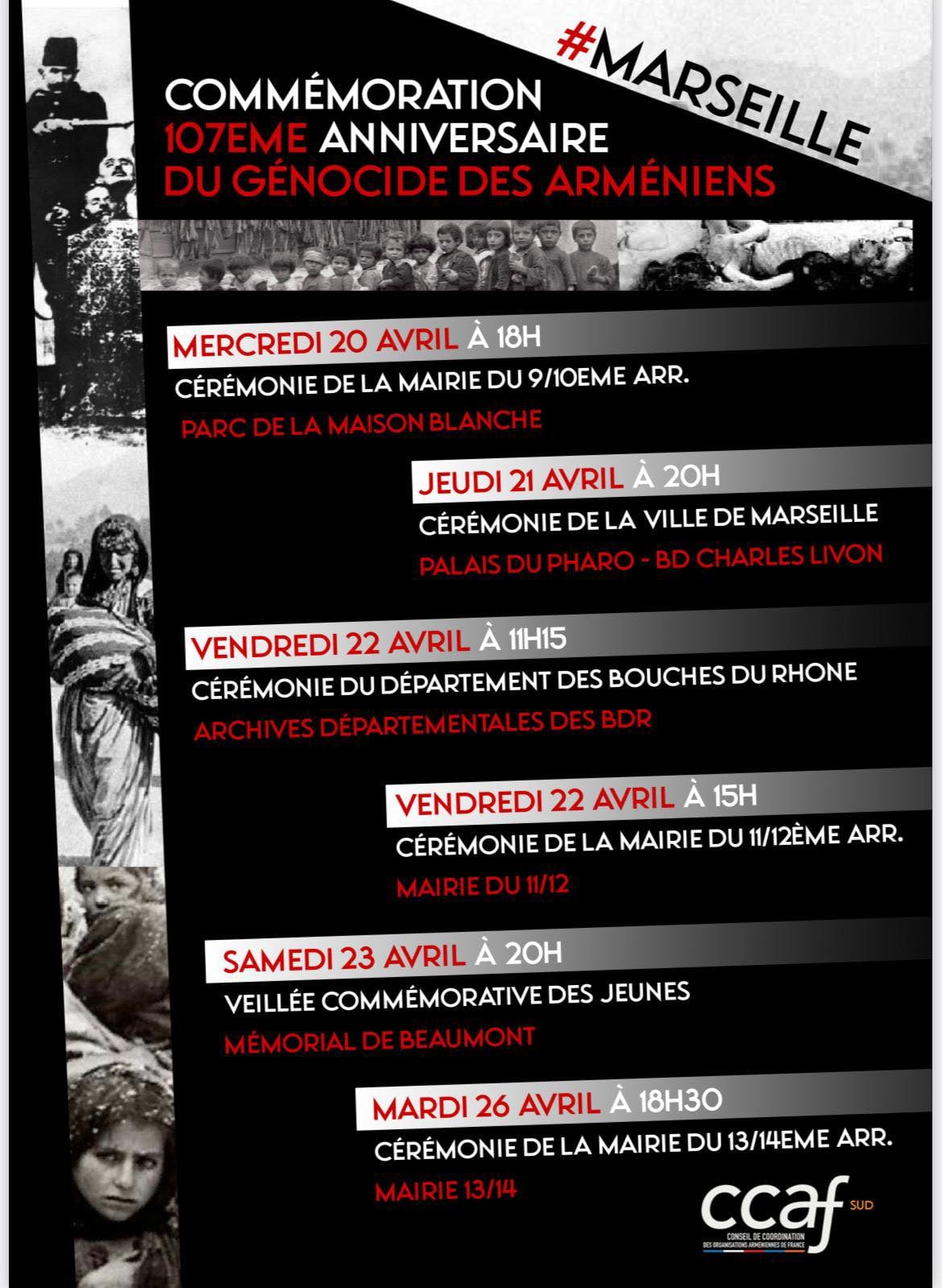 Cette année pour la commémoration du Génocide des Arméniens, le CCAF sud, la Ville de Marseille et le Département des Bouches-du-Rhône organisent deux cérémonies en mémoire des victimes.