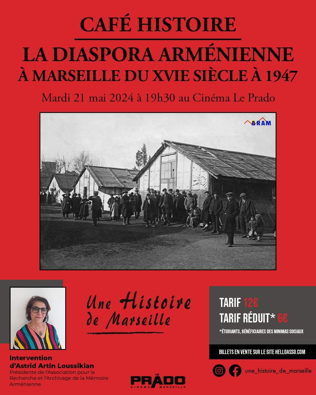Le mardi 21 mai à 19h30, au Cinéma Le Prado, l’association « Une histoire de Marseille », présidée par l’historienne Judith AZIZA, docteure de l’Université d’Aix-Marseille, vous convie à un café histoire, animé par Astrid Artin Loussikian, présidente d’ARAM (Association pour la Recherche et l’Archivage de la Mémoire Arménienne) et professeure d’histoire-géographie.