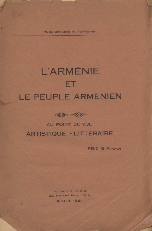 Recueil de texte sur l’art et la littérature arménienne. Publié en 1941 par Hagop Turabian. 28 pages