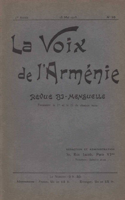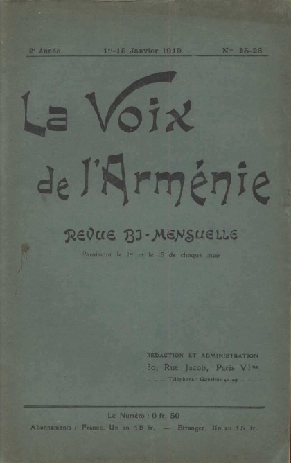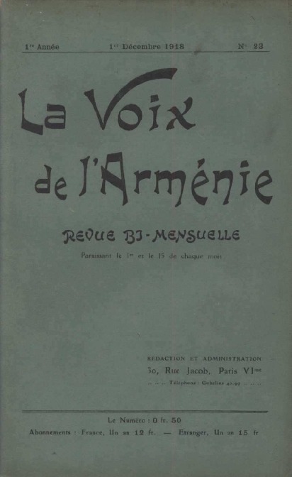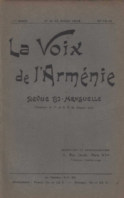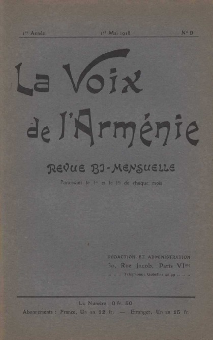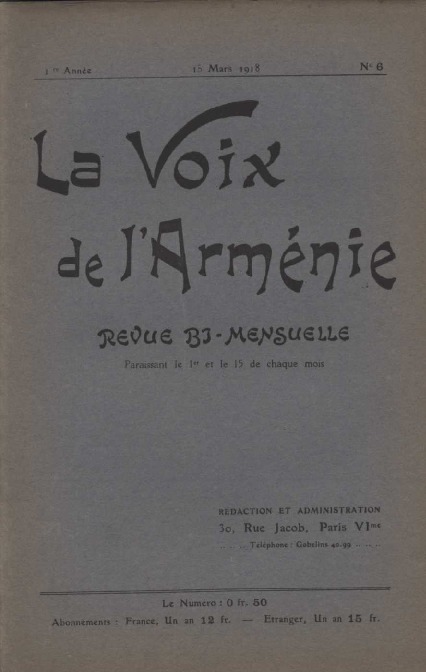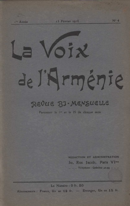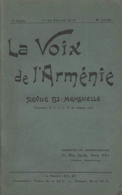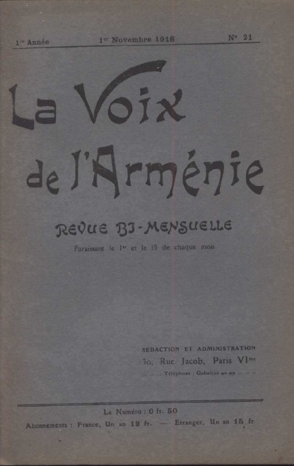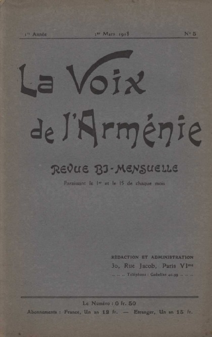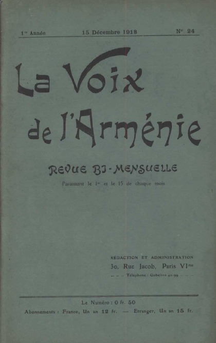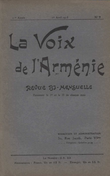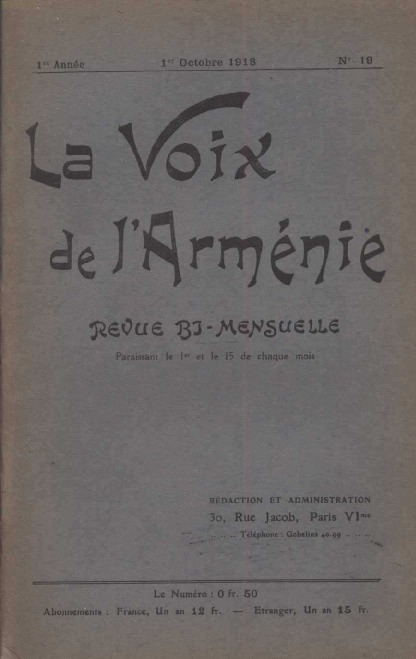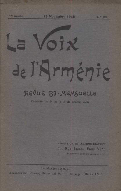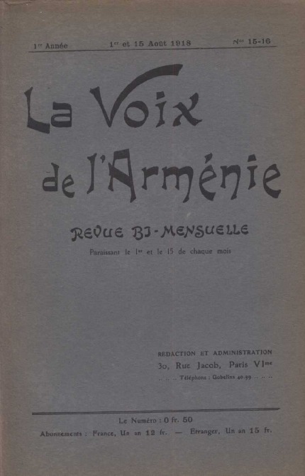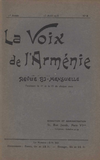 Premier numéro de la Voix de l’Arménie, revue bi-mensuelle, paraissant à Paris. 44 pages.