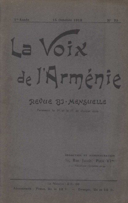 20ème numéro de la Voix de l’Arménie publié le 15 octobre 1918 à Paris. 36 pages.