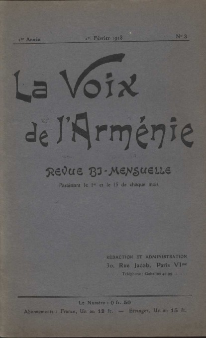 3ème numéro de la Voix de l’Arménie publié le 1er février 1918 à Paris. 36 pages.