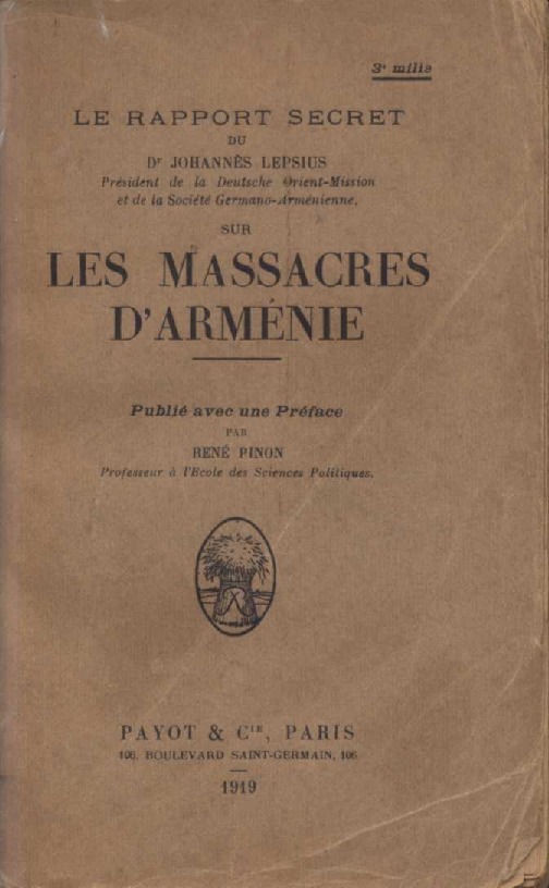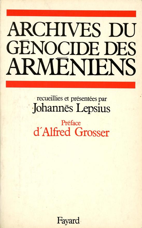 Le rapport secret du docteur Johannès Lepsius, Président de la Deutsche Orient-Mission et de la Société Germano-Arménienne sur les massacres d’Arménie. Fragments du rapport original publié par le comité de célébration du cinquantenaire des Massacres des Arméniens par les Turcs. Publication à Paris en 1966. 105 pages.