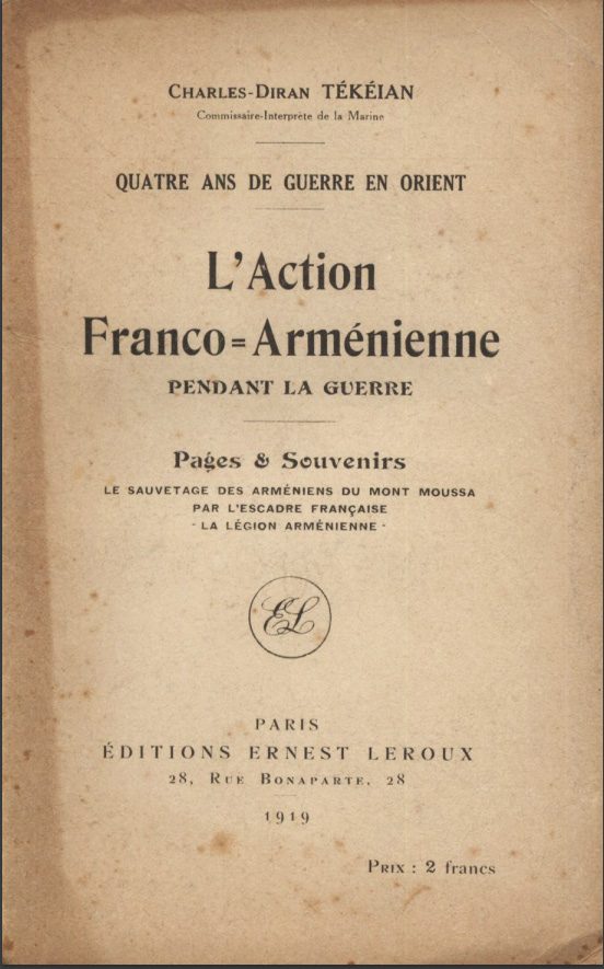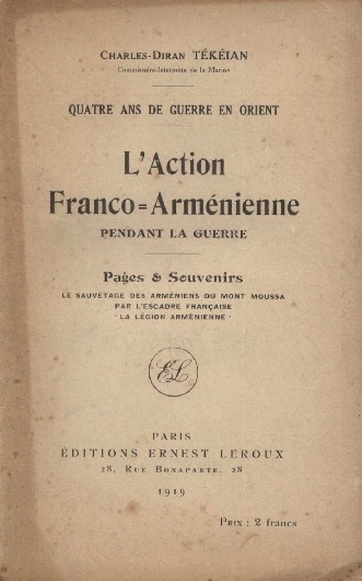 Pages et Souvenirs de quatre ans de guerre en Orient lors de la Première Guerre mondiale. Le sauvetage des arméniens du mont Moussa par l’escadre française – la légion arménienne. Publié par les éditions Ernest Leroux en 1919. 52 pages.