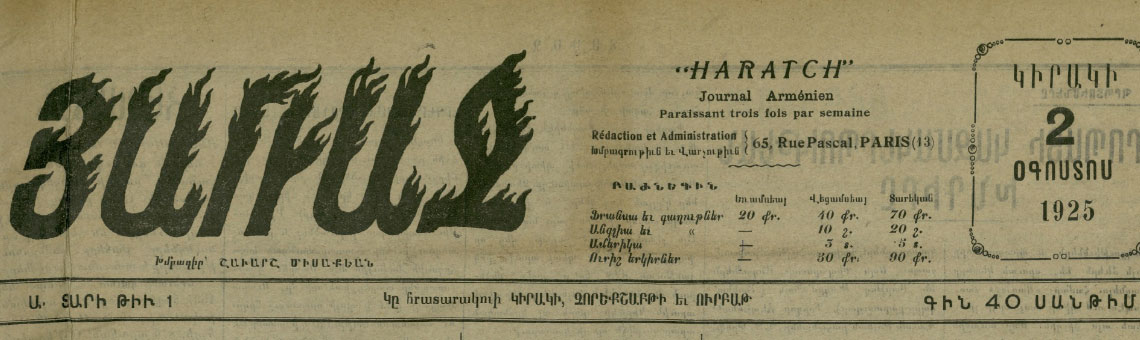 The Association for the Research and the Archiving of Armenian Memory (ARAM) collects, archives and digitizes books, maps, manuscripts, testimonies, photographs and all documents relating to Armenia, Armenians of Anatolia before, during and after the ottoman massacres of 1894-96 and 1909, the genocide of 1915 perpetrated by the “Young Turks” government, and to the history and culture of the armenian diaspora, particularly in France and Europe.