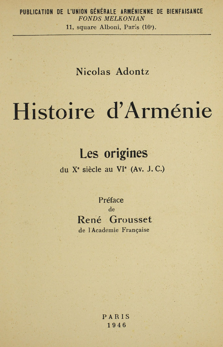 Les origines du Xème au VIème siècle avant J.-C. Publication de l’Union Générale Arménienne de Bienfaisance Fonds Melkonian. Publié à Paris en 1946. 474 pages
