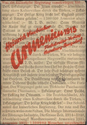 Was die kaiserliche Regierung den deutschen Untertanen verschwiegen hat ARMENIEN 1915 die abschlachtung eines kulturvolkes durch die Türken. Zeuge von Heinrich Vierbücher. Herausgegeben von Fackelreiter-Verlag, Hamburg,