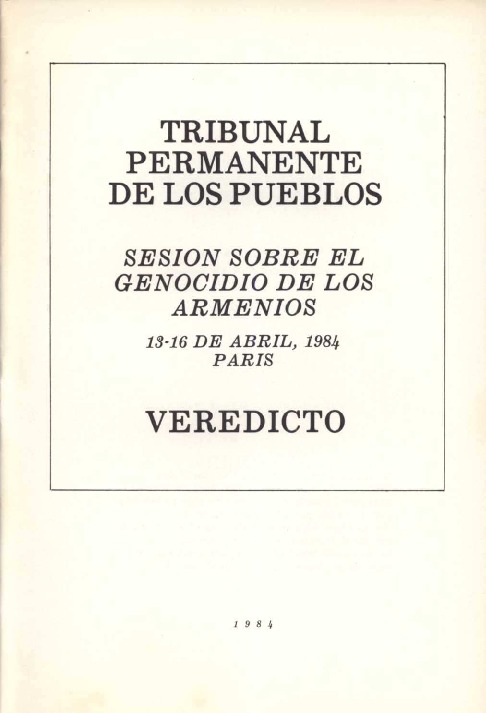 Sesion sobre el genocidio de los Armenios, 13-16 de april, 1984, Paris. Veredicto. 27 páginas. La traducción inglesa del Veredicto del Tribunal Permanente de los Pueblos sobre el caso del Genocidio Armenio ha sido publicada y distribuida por el Zoryan Institute, Cambridge, Massachusetts, con el permiso del Tribunal Permanente de los Pueblos. La presente traducción … Continued