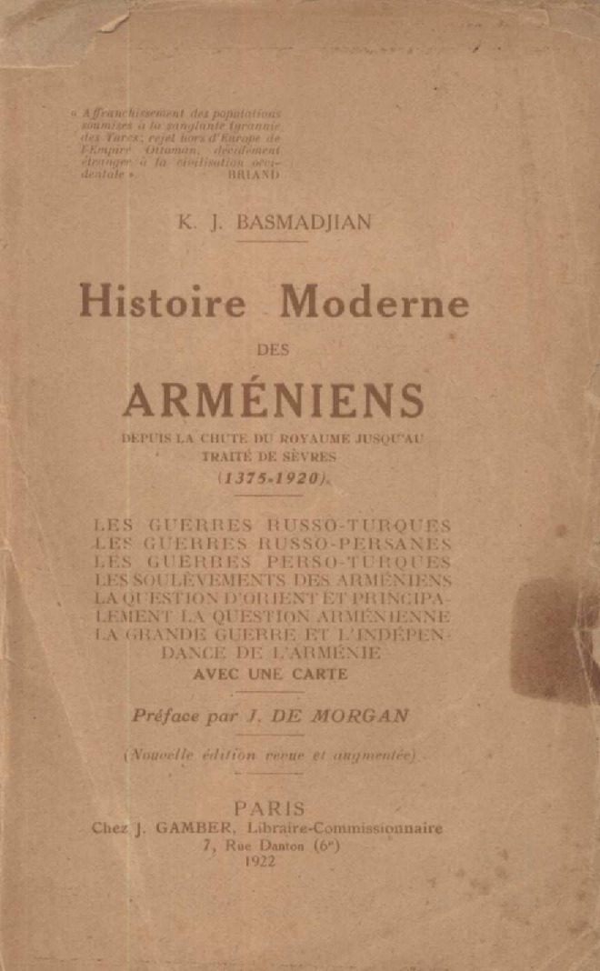 Depuis la chute du royaume jusqu’au traité de Sèvres (1375-1920) Index: LES GUERRES RUSSO-TURQUES LES GUERRES RUSSO-PERSANES LES GUERRES PERSO-TURQUES LES SOULÈVEMENTS DES ARMÉNIENS LA QUESTION D’ORIENT ET PRINCIPALEMENT LA QUESTION ARMÉNIENNE LA GRANDE GUERRE ET L’INDÉPENDANCE DE L’ARMÉNIE Publication J. Gamber, Paris, 1922. 257 pages.