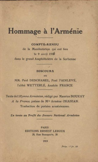 Compte-rendu de la manifestation qui eut lieu le 9 avril 1919 dans le grand Amphithéâtre de la Sorbonne. Discours de Paul Deschanel, Paul Painlevé, l’Abbé Wetterlé, Anatole France Texte de l’Hymne Arménien, rédigé par Maurice Boukay, A la France, poème d’Armène Ohanian. Traduction de poésies arméniennes. Publications de l’Union Intellectuelle Arménienne de Paris. Editions Ernest-Leroux, … Continued