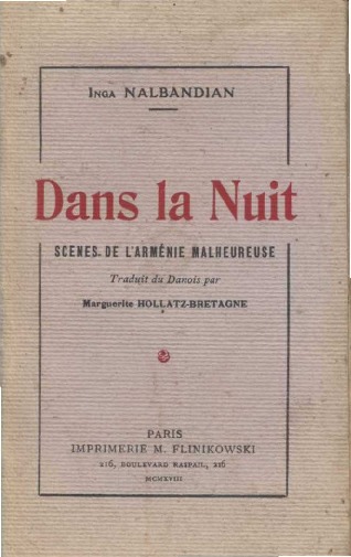 Scènes de l’Arménie malheureuse. Traduit du danois par Marguerite Hollatz-Bretagne Imprimeries Flinikowski, Paris, 1918. 156 pages.