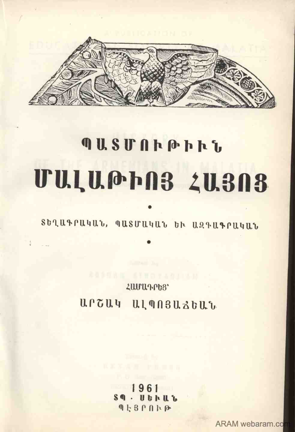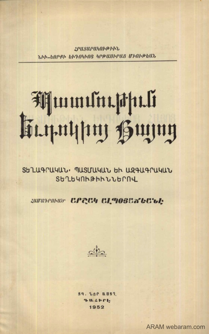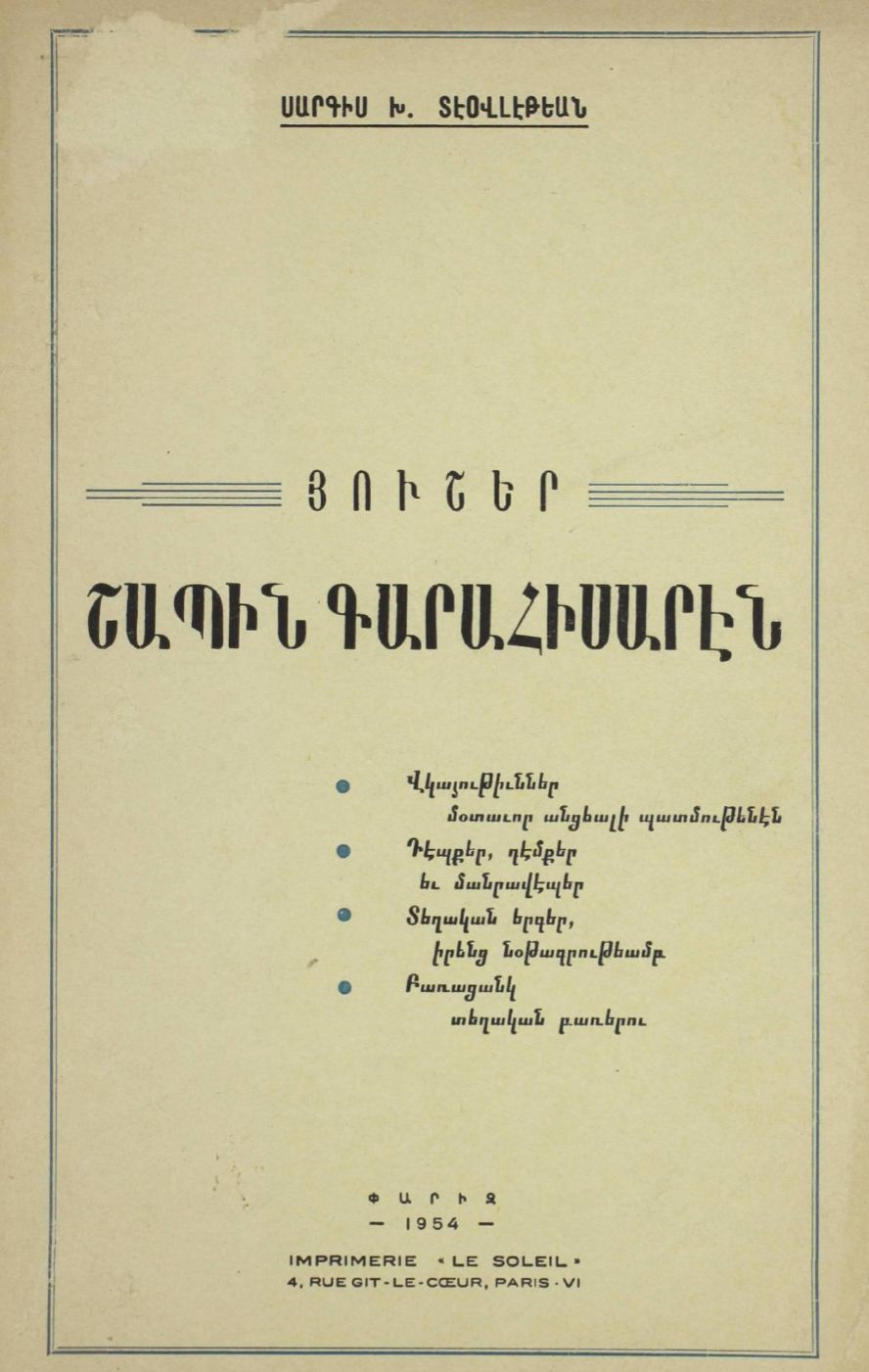 Livre patrimonial sur la ville de Bardizag et sa région par Hagop Der Hagopian, publicitiste et journaliste au journal Vertchin Lour à Paris. Livre augmenté de photographie, de cartes, d’un dictionnaire des végétaux de Bardizag et d’un lexique du patois de Bardizag.