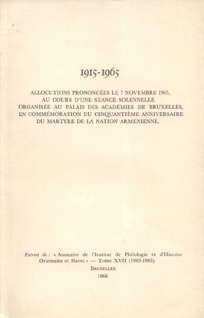 ALLOCUTIONS PRONONCÉES LE 7 NOVEMBRE 1965, AU COURS D’UNE SÉANCE SOLENNELLE ORGANISÉE AU PALAIS DES ACADÉMIES DE BRUXELLES, EN COMMÉMORATION DU CINQUANTIÈME ANNIVERSAIRE DU MARTYRE DE LA NATION ARMÉNIENNE. Publié à Bruxelles en 1966. 32 pages. Sommaire: Les Arméniens, leur langue et leur littérature Sur les caractères dominants de la tradition arménienne La place de … Lire la suite