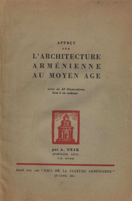 Apercu sur l’architecture arménienne au moyen-âge (du Vème au XIIIème siècle) Orné de 62 illustrations dont 8 en couleur. Edité par les amis de la culture arménienne, Le Caire, en 1951. 76 pages.