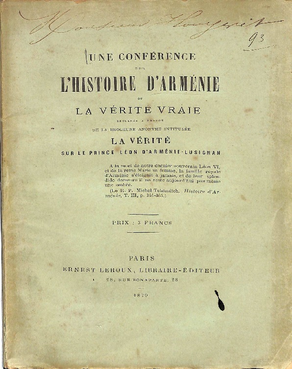 Une conférence sur l’histoire d’Arménie ou la vérité vraie déclarée à propos de la brochure anonyme intitulée la vérité sur le prince Léon d’Arménie-Lusignan. Publication par Ernest Leroux à Paris en 1879. 120 pages.
