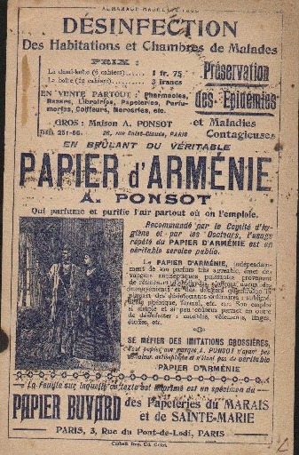 Publicité pour le papier d’Arménie Auguste Ponsot. À la fin du XIXème siècle, Auguste Ponsot, chimiste, découvre lors d’un voyage que les Arméniens font brûler du benjoin, une résine qui vient de Malaisie, pour parfumer et désinfecter leurs maisons3. Auguste Ponsot va adapter cette pratique en France avec Henri Rivier, pharmacien. D’abord le benjoin est … Lire la suite