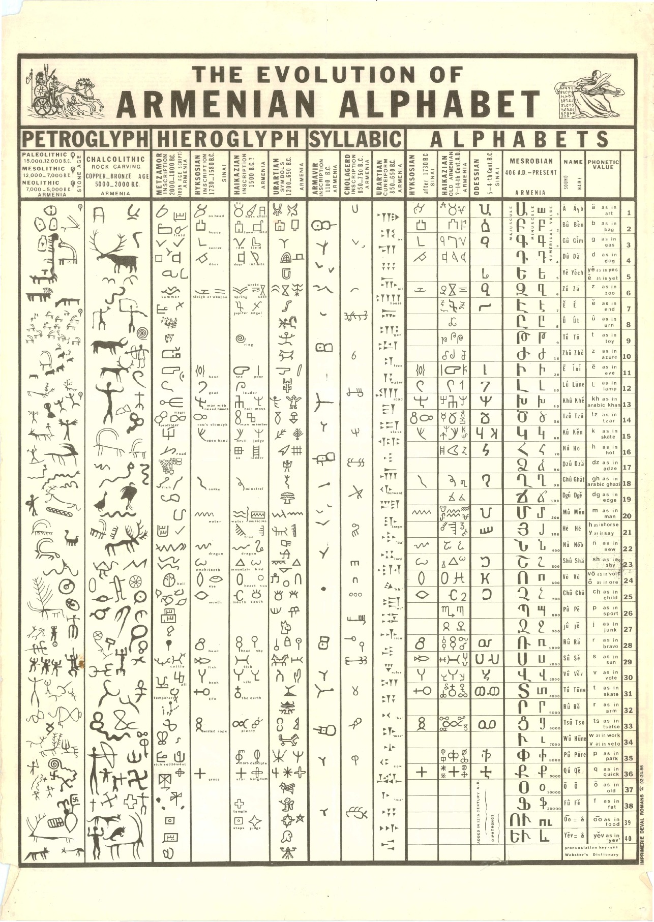 The evolution of Armenian and world alphabets by Melkon Armen Khandjian. Chart of the evolution of Armenian alphabet, from the Stone Age to the present. Armenological studies research and exhibits. Published by Atla april 24, 1976. U.S.A.