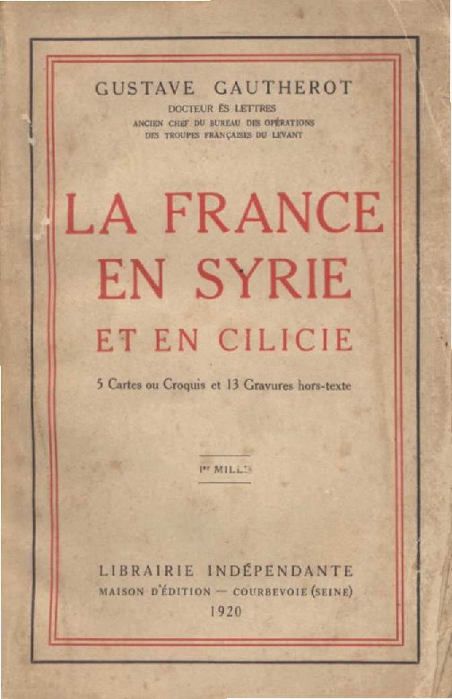 Gustave Gautherot est l’ancien chef du bureau des opérations des troupes françaises du Levant. Il pose la question de l’avenir de la Syrie et de la Cilicie après la Première Guerre mondiale. Publication par la Librairie Indépendante à Courbevoie en 1920. 204 pages.
