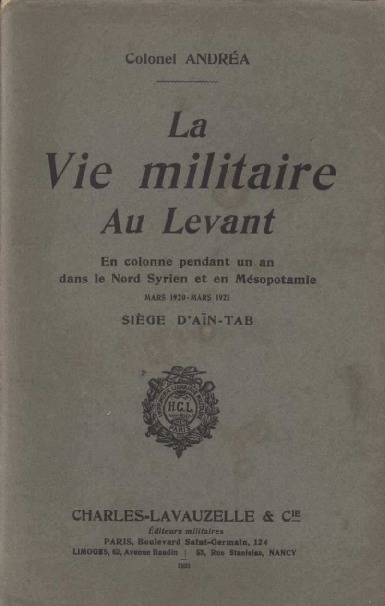 La Vie militaire au Levant. En colonne pendant un an dans le Nord syrien et en Mésopotamie. Mars 1920-mars 1921. Siège d’Ain-Tab. Monographie imprimée. Publication par Charles-Lavauzelle, éditeurs militaires à Paris en 1923. 223 pages.