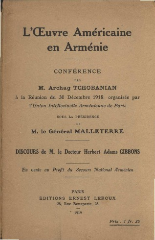 Conférence de Archag Tchobanian à la réunion du 30 décembre 1918 organisée par l’Union Intellectuelle Arménienne de Paris. Discours du Dicteur Herbert Adams Gibbons. Publication par les éditions Ernest Leroux à Paris en 1919. 48 pages.