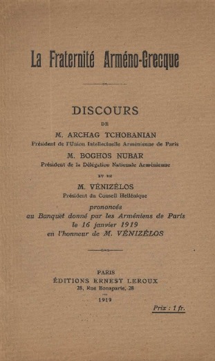 Recueil des discours de Archag Tchobanian, Président de l’Union intellectuelle Arménienne de Paris, Boghos Nubar, Président de la Délégation Nationale Arménienne, et de M. Vénizélos, Président du Conseil Hellénique, prononcés au banquet donné par les Arméniens de Paris le 16 janvier 1919. Publié en 1919 à Paris. 42 pages