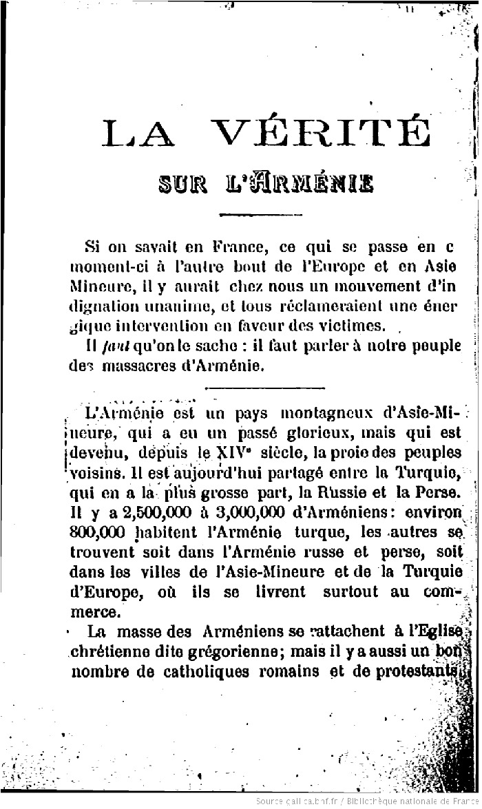 Brochure vendue au profit de la propagande arménienne. Texte de Paul PASSY. Imprimé à Paris en 1896. 7 pages