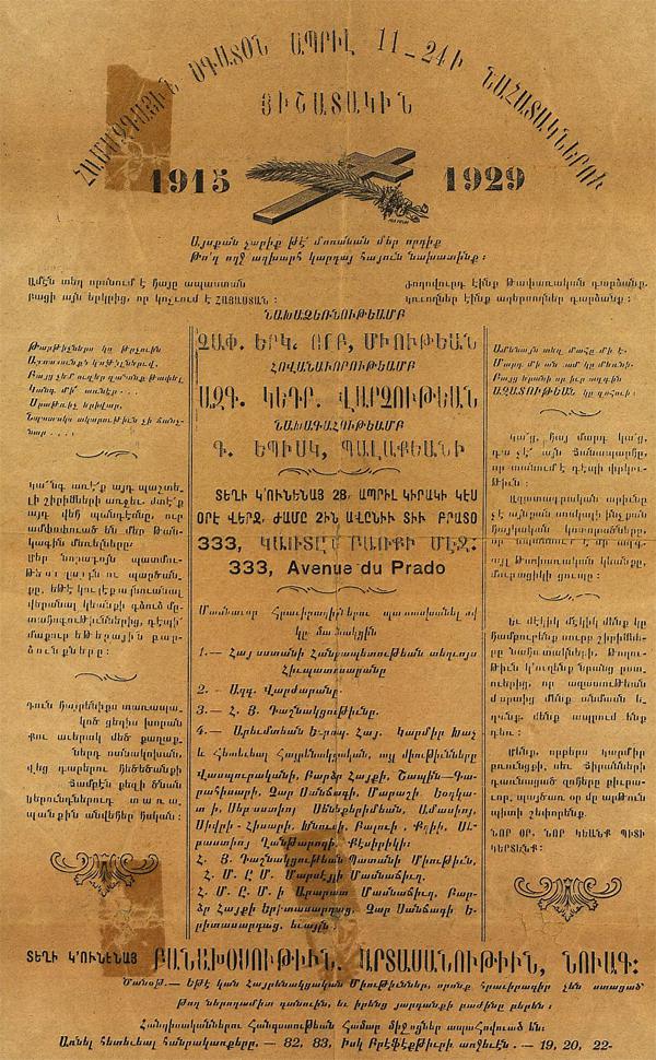 Collection d’affiches arméniennes éditées dans la région de Marseille entre 1927 et 2000, et, ayant trait aux divers aspects de la vie associative, culturelle, cultuelle et politique de la communauté arménienne de Marseille et de France, depuis l’arrivée des premiers rescapés du génocide de 1915 jusqu’à l’aube du XXIème siècle.