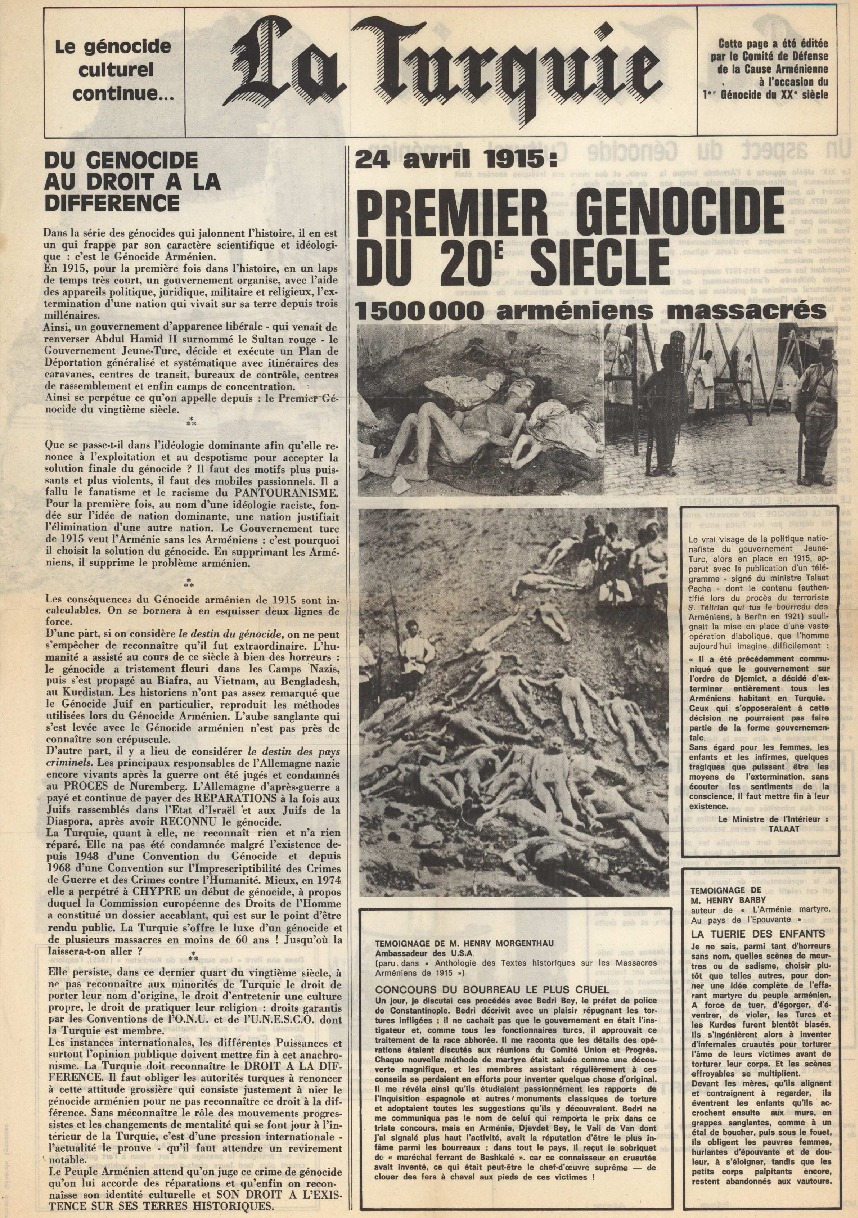 Page éditée par le comité de défense de la cause arménienne en 1975. 2 pages Du génocide au droit à la différence.