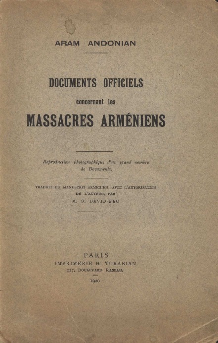 Plaidoyer et réquisitoire Imprimeries H Turabian, Paris, 1919. 153 pages. Sommaire I – Les revendications arméniennes II – La question arménienne et les massacres de 1894-1896 III – Les années terribles 1915-1916-1917-1918