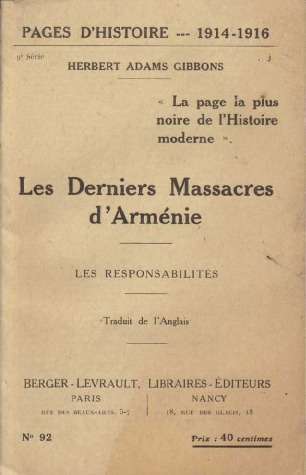 Page d’histoire 1914 – 1916. La page la plus noire de l’Histoire moderne. Les derniers massacres d’Arménie. Les responsabilités. Publication par Berger-Levrault à Paris . 49 pages.