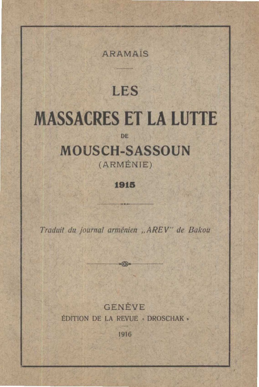 Traduit du journal arménien de Bakou « Arev ». Publication des éditions de la revue DROSCHAK à Genève en 1916. 65 pages.