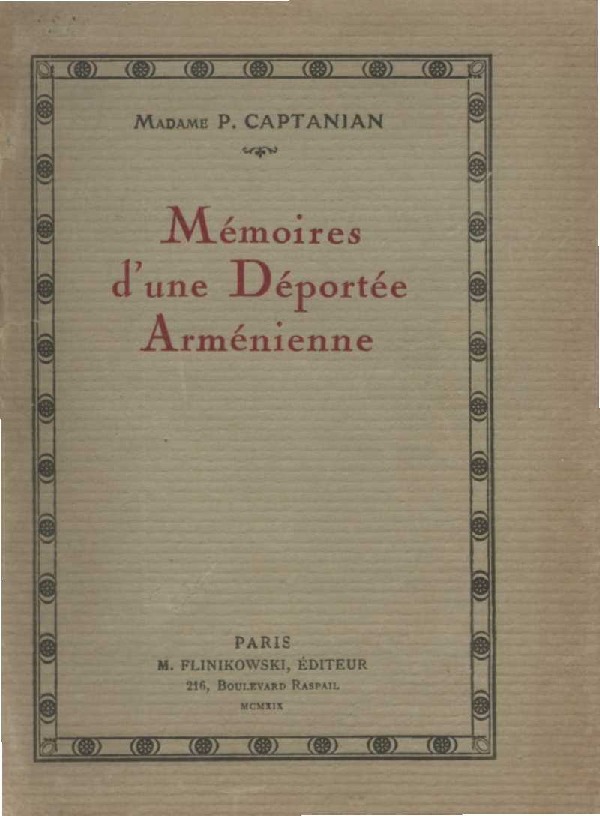 « Je présente ce livre à mes compatriotes endeuillés qui se trouvent en terre étrangère, impatients de connaître toute la vérité sur les déportations de 1915. C’est le témoignage d’une exilée qui partagea les souffrances infligées par la cruauté turque à des milliers de malheureux. » Publication par les éditeurs Flinikowski à Paris en 1919. 144 pages.