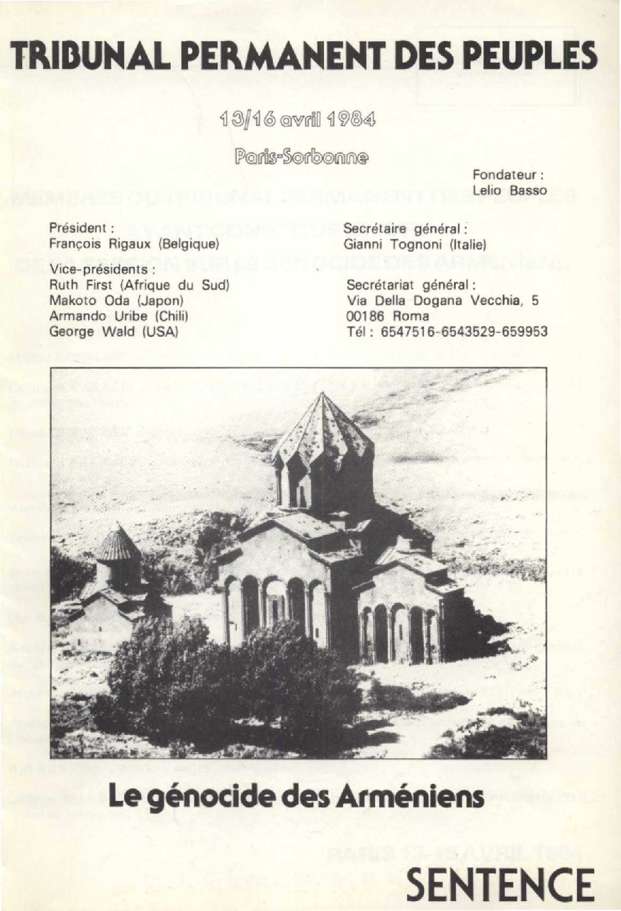 Compte-rendu de la conférence du tribunal permanent des peuples le 13 et 16 avril 1984 à Paris-Sorbonne sur le génocide arménien. 19 pages.