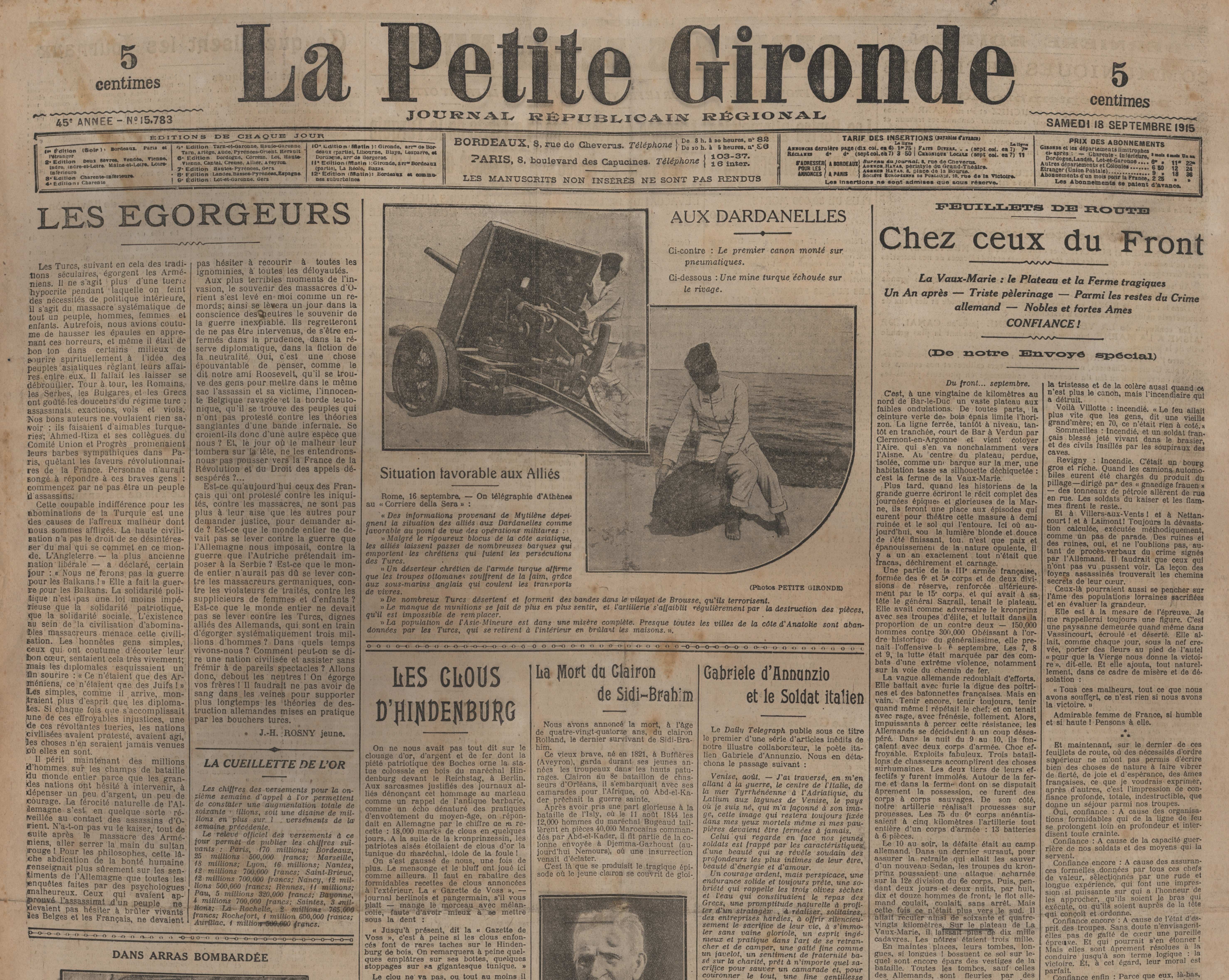 Editorial de J.-H. ROSNY paru dans le journal régional La Petite Gironde le 18 septembre 1915 alertant des massacres du peuple arménien par les Turcs.