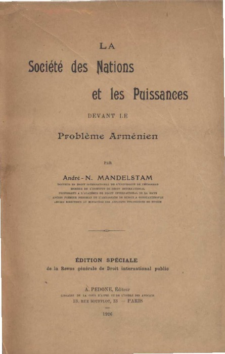 Edition spéciale de la Revue générale de Droit international public. Publication par la librairie de la cour d’appel et de l’ordre des avocats à Paris en 1926. 363 pages.
