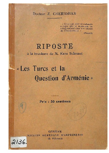 Pamphlet publié en riposte au livre de Kara Schemsi « Turcs et Arméniens devant l’histoire. Nouveaux témoignages Russe et Turcs sur les atrocités Arméniennes de 1914 à 1918 » Publié en nom propre en 1919 à Genève. 47 pages