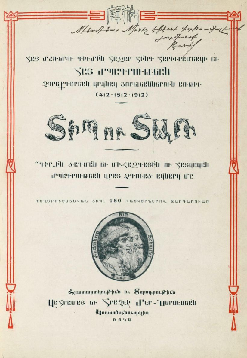 Histoire de l’Imprimerie Arménienne dans le Monde depuis 1512, édité pour le 400e anniversaire du livre imprimé arménien.