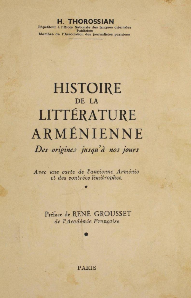 Notice biographique et bibliographique rédigée d’après le texte arménien de K. Fenerdjian. Jubilé des 50 ans d’activité littéraire d’Archag Tchobanian. Paru en 1938. 52 pages.