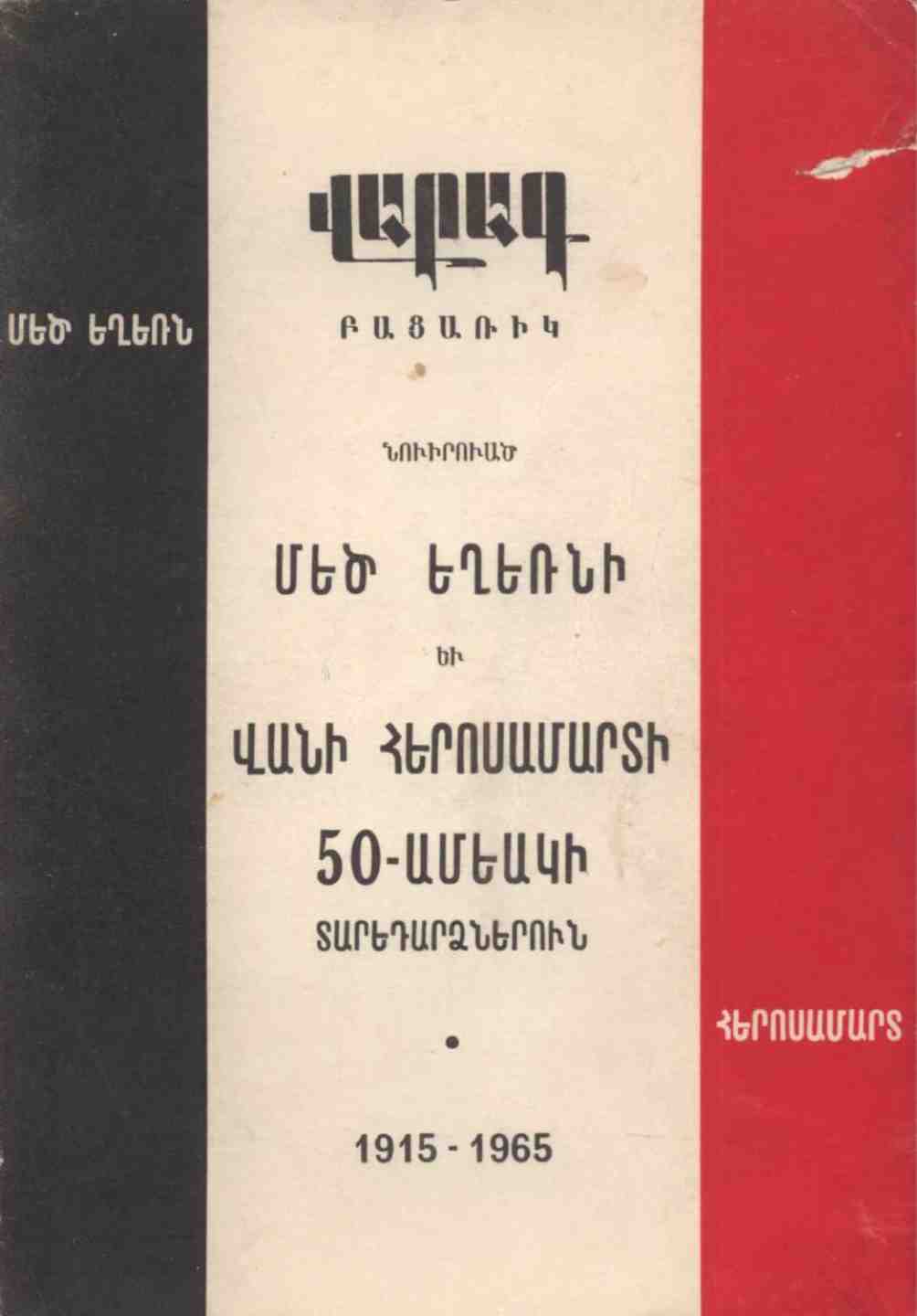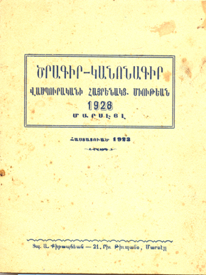 7 : Samedi 13 avril 1929 Au Bon Théâtre de la rue Chappe à Marseille à 20h30 Représentation de la pièce La Résistance du Vasbouragan de Manouel Maroutian organisée par la FRA Dashnaktsoutioun. Le portrait d’Aram Pasha, l’un des commandants dashnaks de Van est mis en évidence au-dessus de celui de M. Maroutian.  Sur les côtés, … Lire la suite