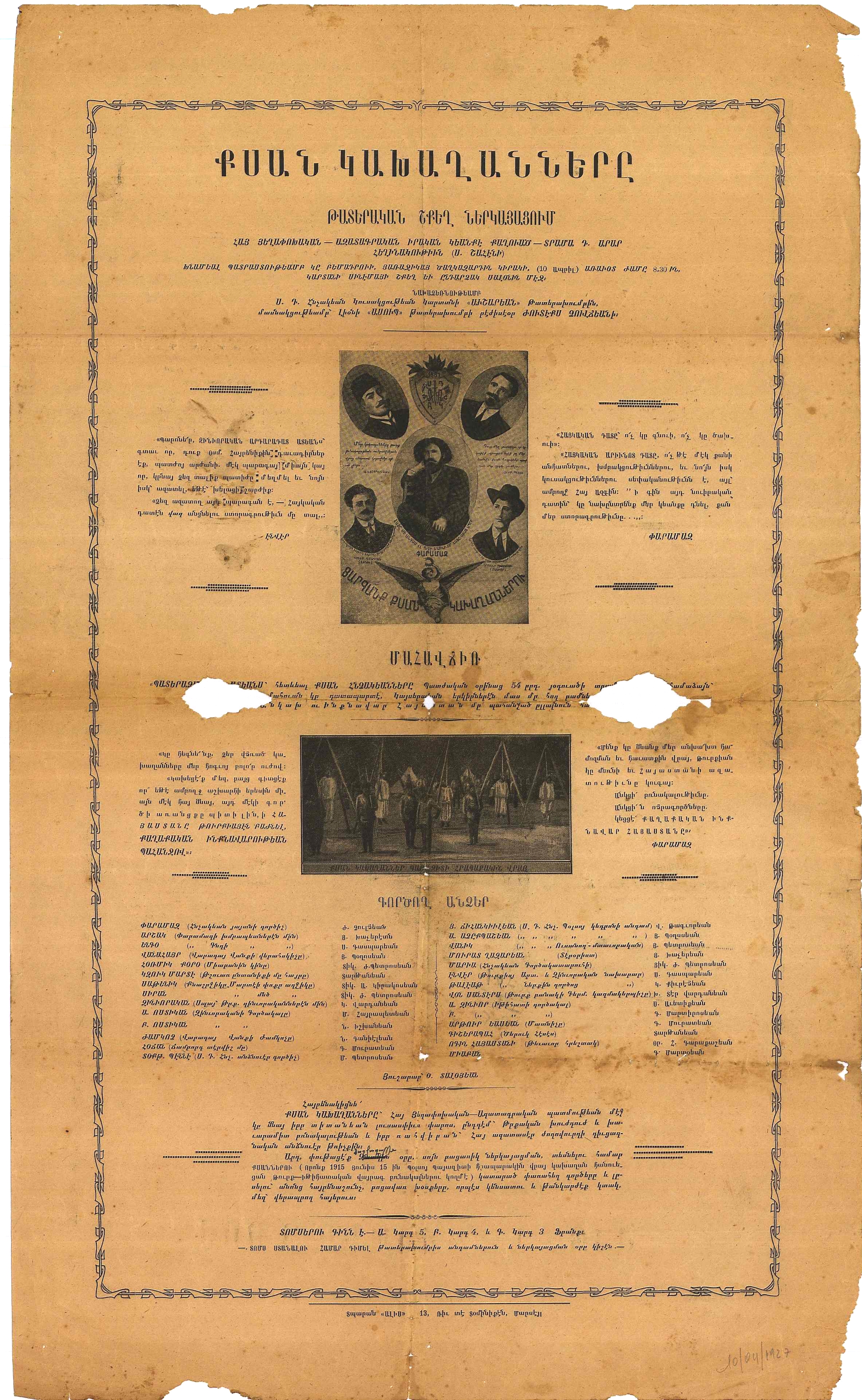7 : Samedi 13 avril 1929 Au Bon Théâtre de la rue Chappe à Marseille à 20h30 Représentation de la pièce La Résistance du Vasbouragan de Manouel Maroutian organisée par la FRA Dashnaktsoutioun. Le portrait d’Aram Pasha, l’un des commandants dashnaks de Van est mis en évidence au-dessus de celui de M. Maroutian.  Sur les côtés, … Lire la suite