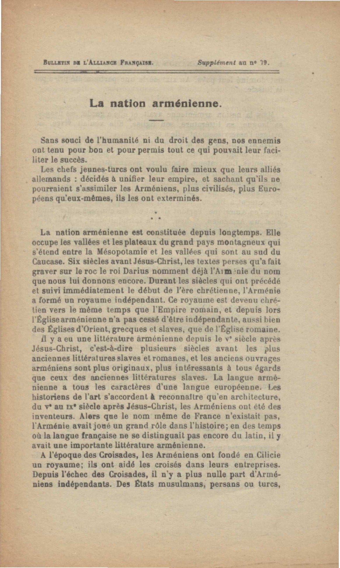 The destruction of the Turkish Armenians. Article by Albert Thomas, Head of the french war munitions department, published in the Manchester gardian, November 24th 1915. 10 pages.