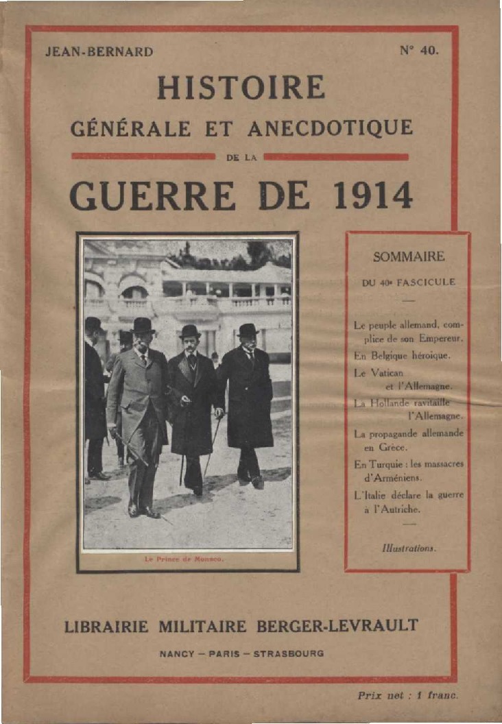 Fascicule numéro 40. Extrait concernant le massacre des Arméniens en Turquie. Publication par la librairie militaire Berger-Levrault en 1915. 14 pages