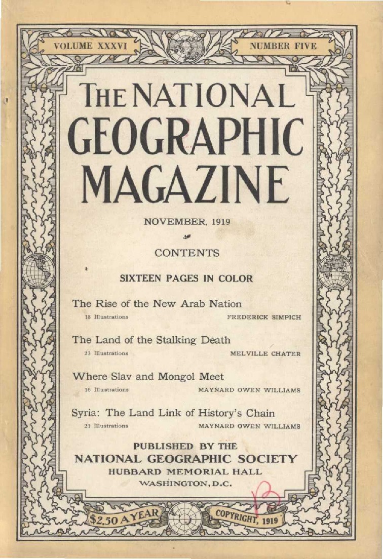 Article about « The land of the Stalking Death» by Melville Chater. A journey through starving Armenia on an american relief train. Published in november 1919 by the National Geographic Society, Washington D.C. 35 pages.