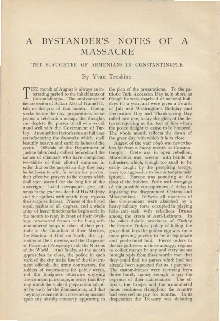 A bystander’s note of a massacre. The slaughter of Armenians in Constantinople. Article by Yvan Troshine Published in january 1897. 20 pages.