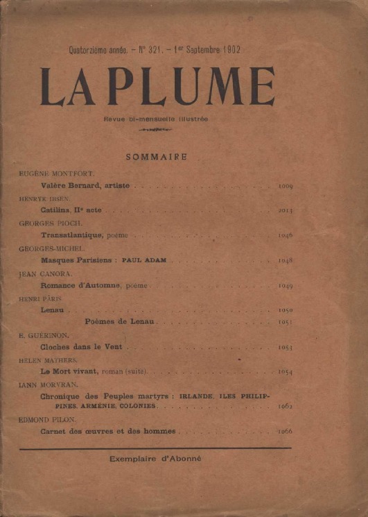 Publication dans la revue La Plume d’une chronique des Peuples Martyrs par Iann Morvran où il est question de l’Irlande, les Philippines, des colonies et de l’Arménie. Publication le 1er septembre 1902.