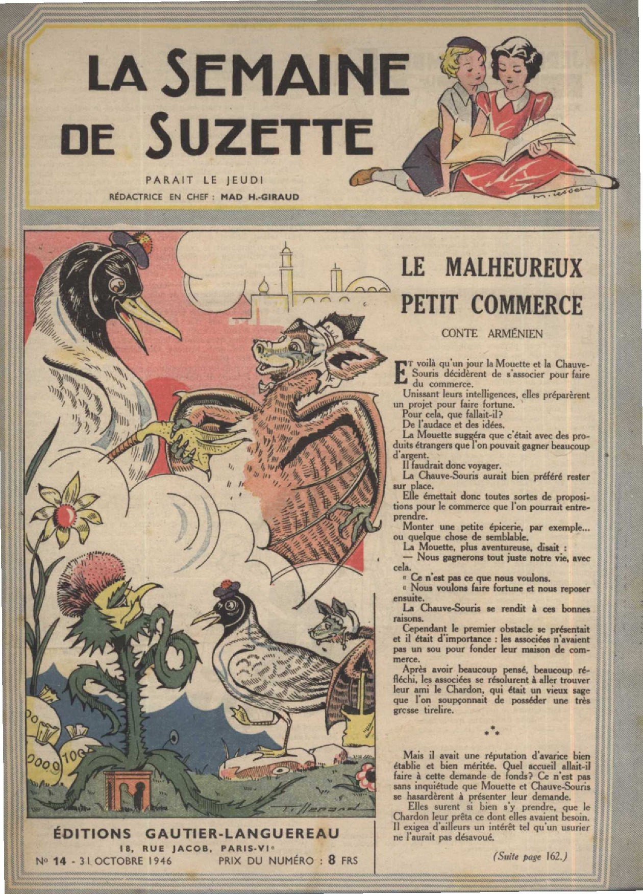 Le malheureux petit commerce, conte arménien. Illustrations couleurs de G. Tisserand. Paru le 31 octobre 1946 aux éditions Gautier-Languereau