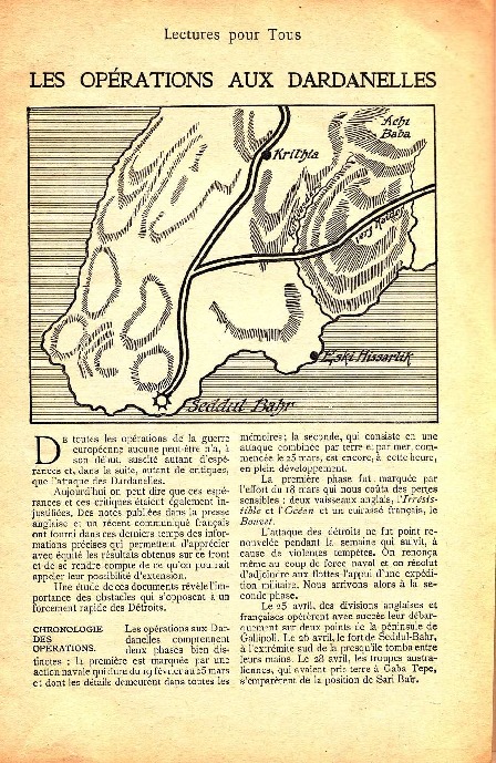Article sur les opérations aux Dardanelles dans la revue Lecture pour tous. Publication par Hachette et compagnie le 1er juillet 1915.