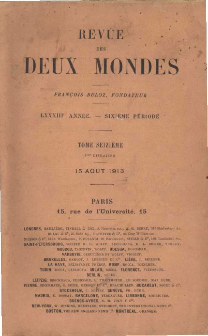 Tome 16. Article sur la réorganisation de la Turquie d’Asie par René Pinon. Parution le 15 août 1913. 37 pages.