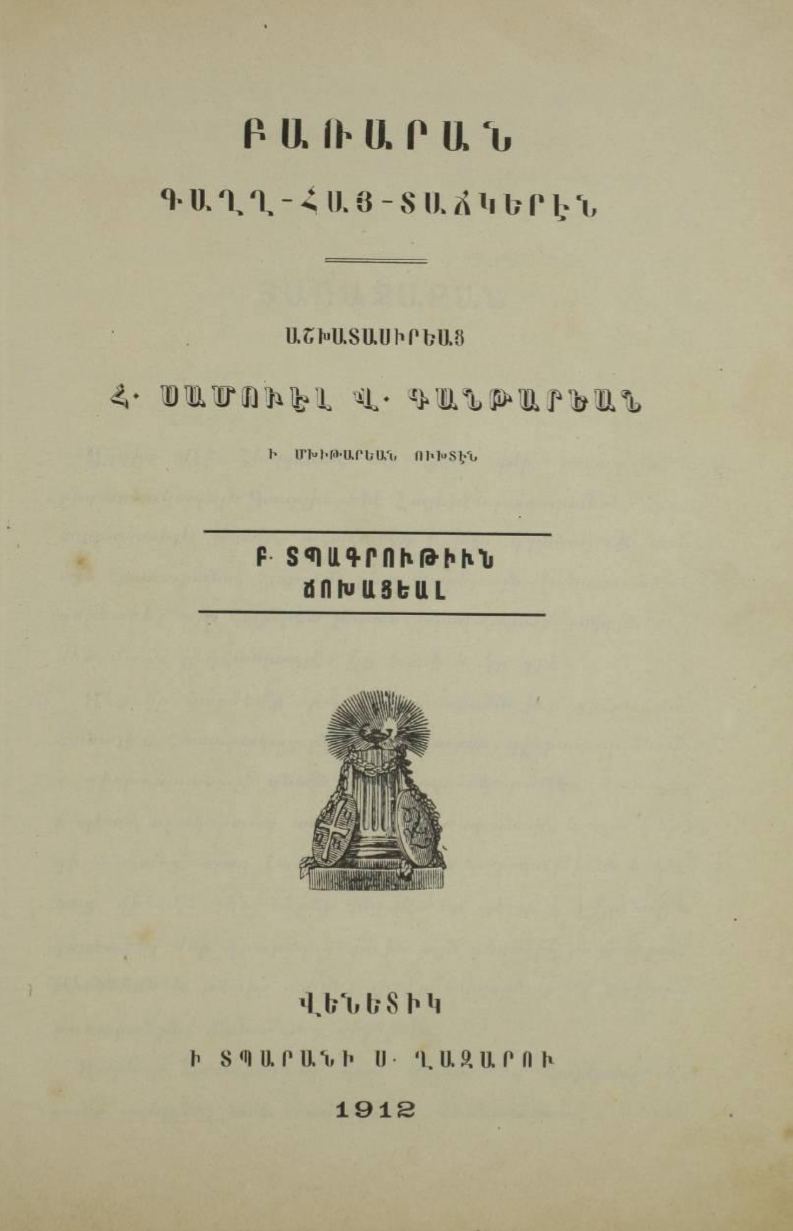 Les articles et définitions de ce dictionnaire trilingue sont très complet et introduisent dans la langue arménienne des concepts nouveaux tel que la langue anglaise les véhicule en 1908. C’est par exemple le mot « design »