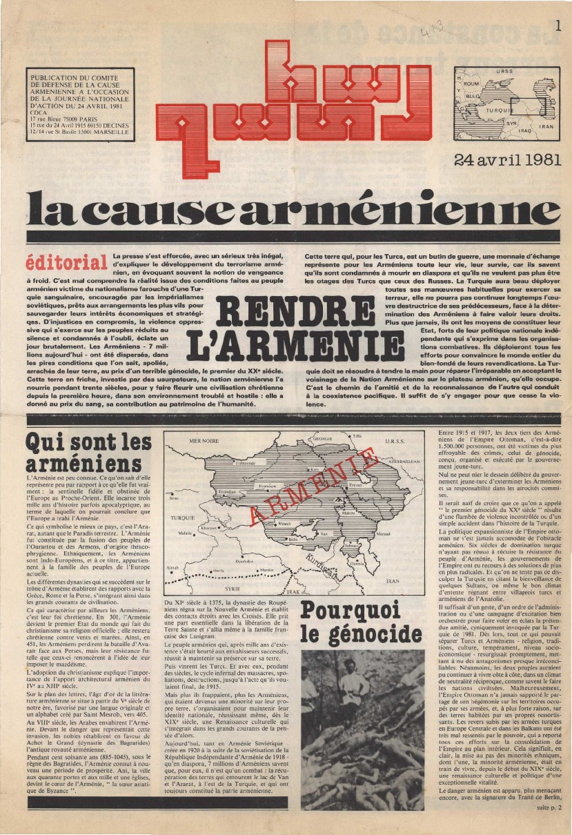 Publication du comité de défense de la cause Arménienne à l’occasion de la journée nationale d’action du 24 avril 1981.